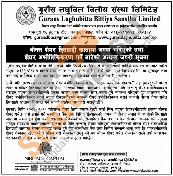 Gurans Laghubitta Bittiya Sanstha Limited is distributing 7.612% bonus shares directly to DEMAT accounts of its shareholders and has urged to dematerialize their shares.