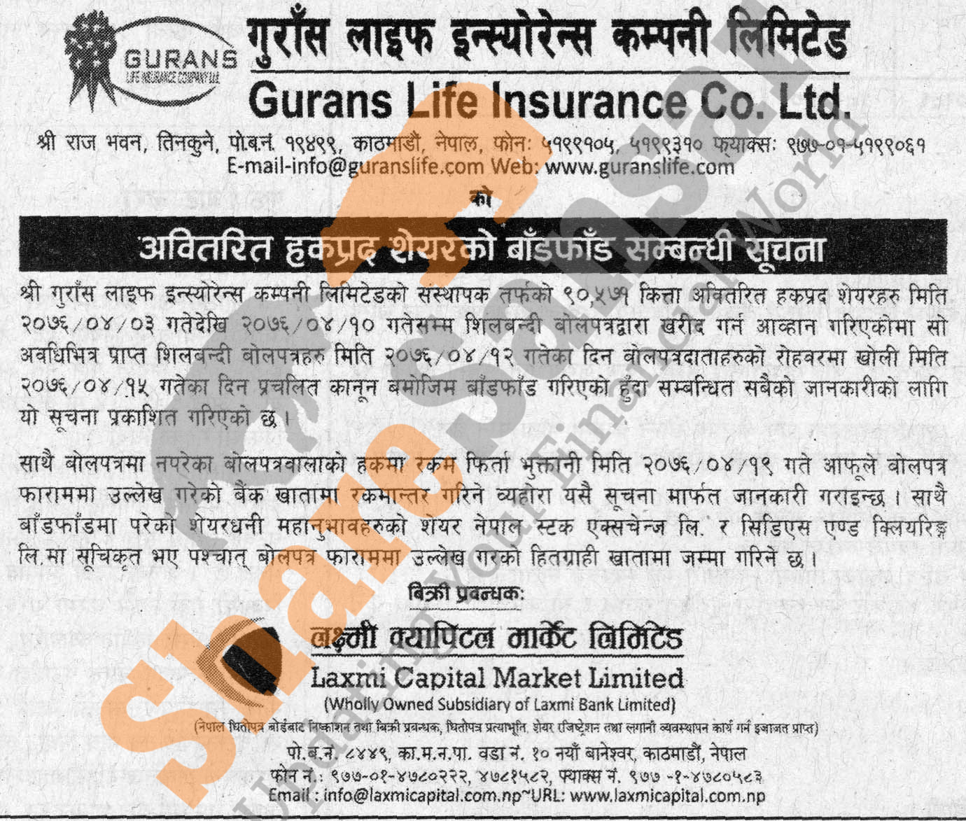 Gurans Life Insurance Company Limited has allotted its 90,571 unit promoter shares in auction to the general public on 15th Shrawan, 2076 and refunding money to non-allottee investors from (19th Shrawan, 2076).