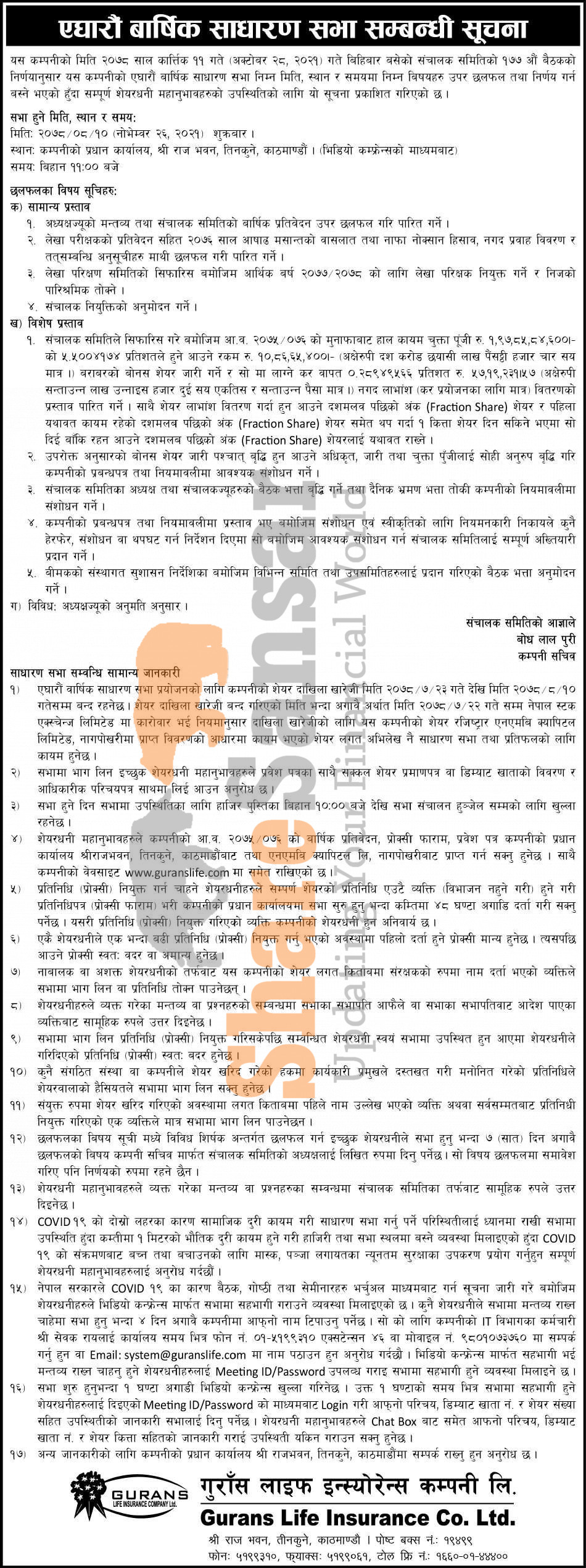 Gurans Life Insurance Company Limited has announced its 11th AGM going to be held on 10th Mangsir, 2078.