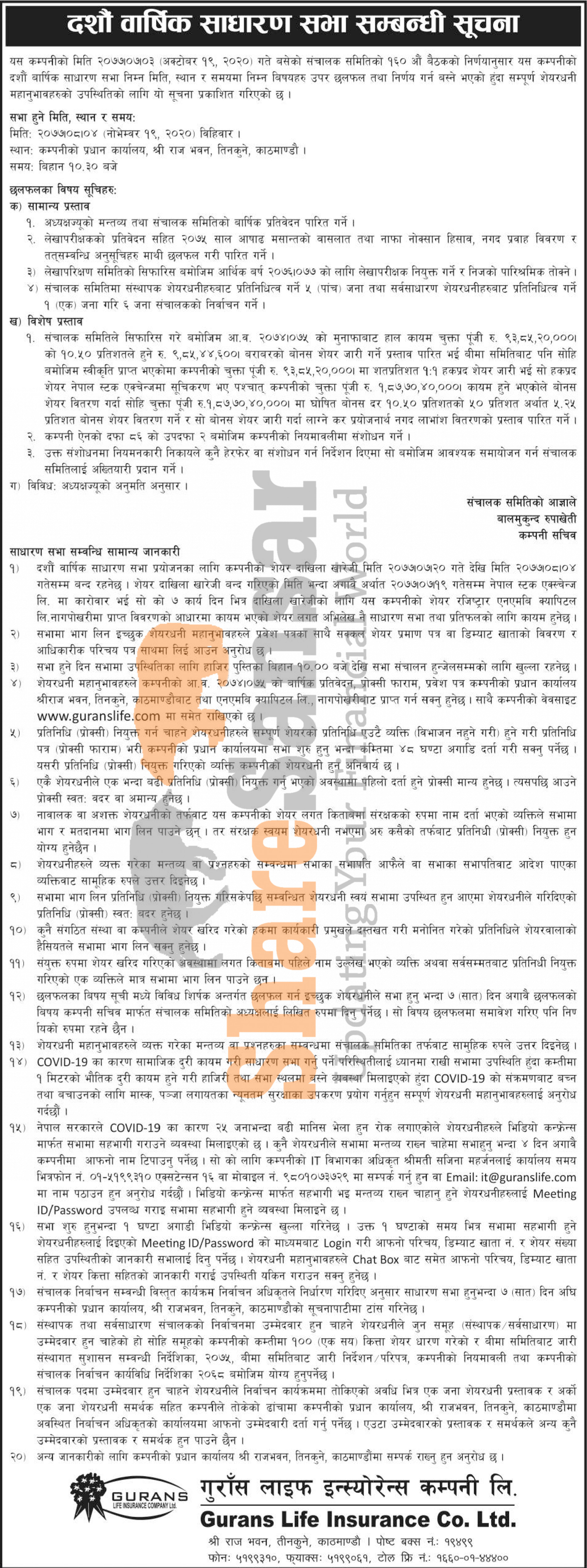 Gurans Life Insurance Company Limited has announced its 10th AGM going to be held on 4th Mangsir, 2077.