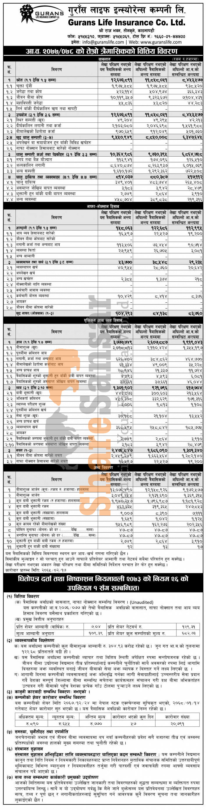 Gurans Life Insurance Company Limited has posted a net profit of Rs 104.29 million and published its 3rd quarter company analysis of the fiscal year 2077/78.