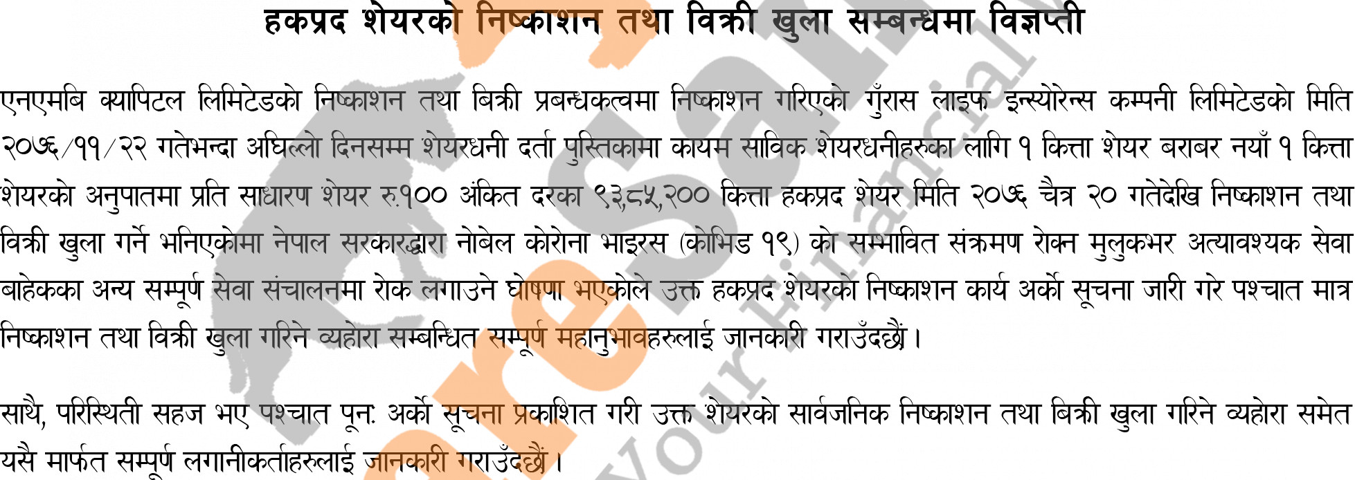 Gurans Life Insurance Company Limited has postponed its 1:1 ratio right share issue till further notice.