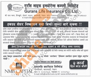Gurans Life Insurance Company Limited is closing it's ongoing 1:1 ratio 93,85,200 units right share issue to its shareholders from 4th Shrawan, 2077.