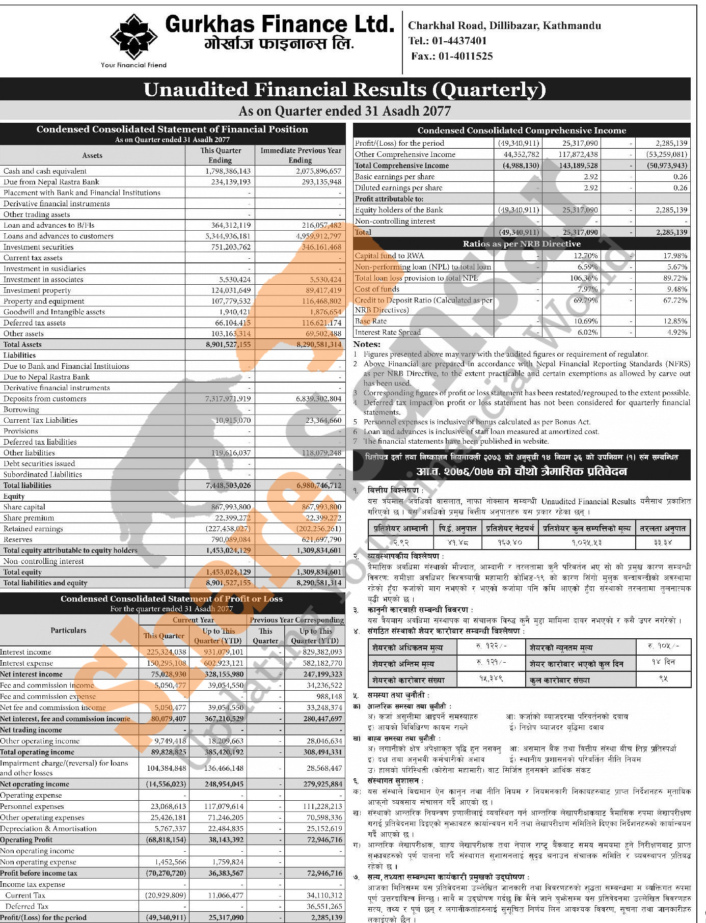 Gurkhas Finance Limited has posted a net profit of Rs 25.31 million and published its 4th quarter company analysis of the fiscal year 2076/77.