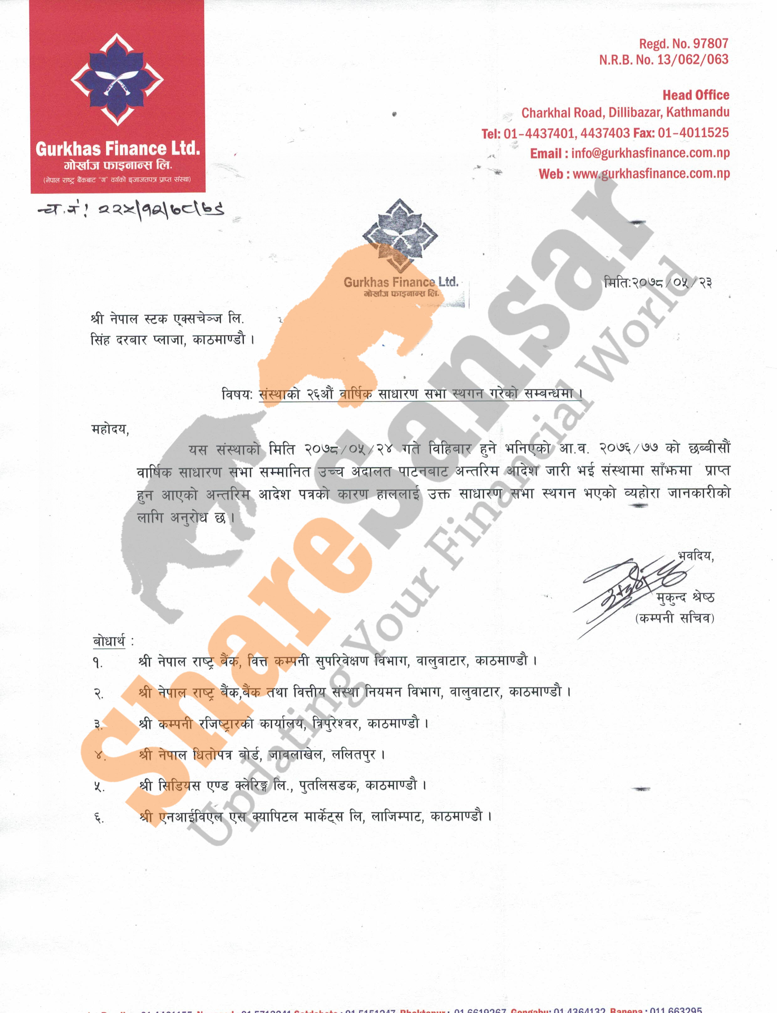 Gurkhas Finance Limited has postponed its 26th AGM going to be held on 24th Bhadra,2078 until further notice.