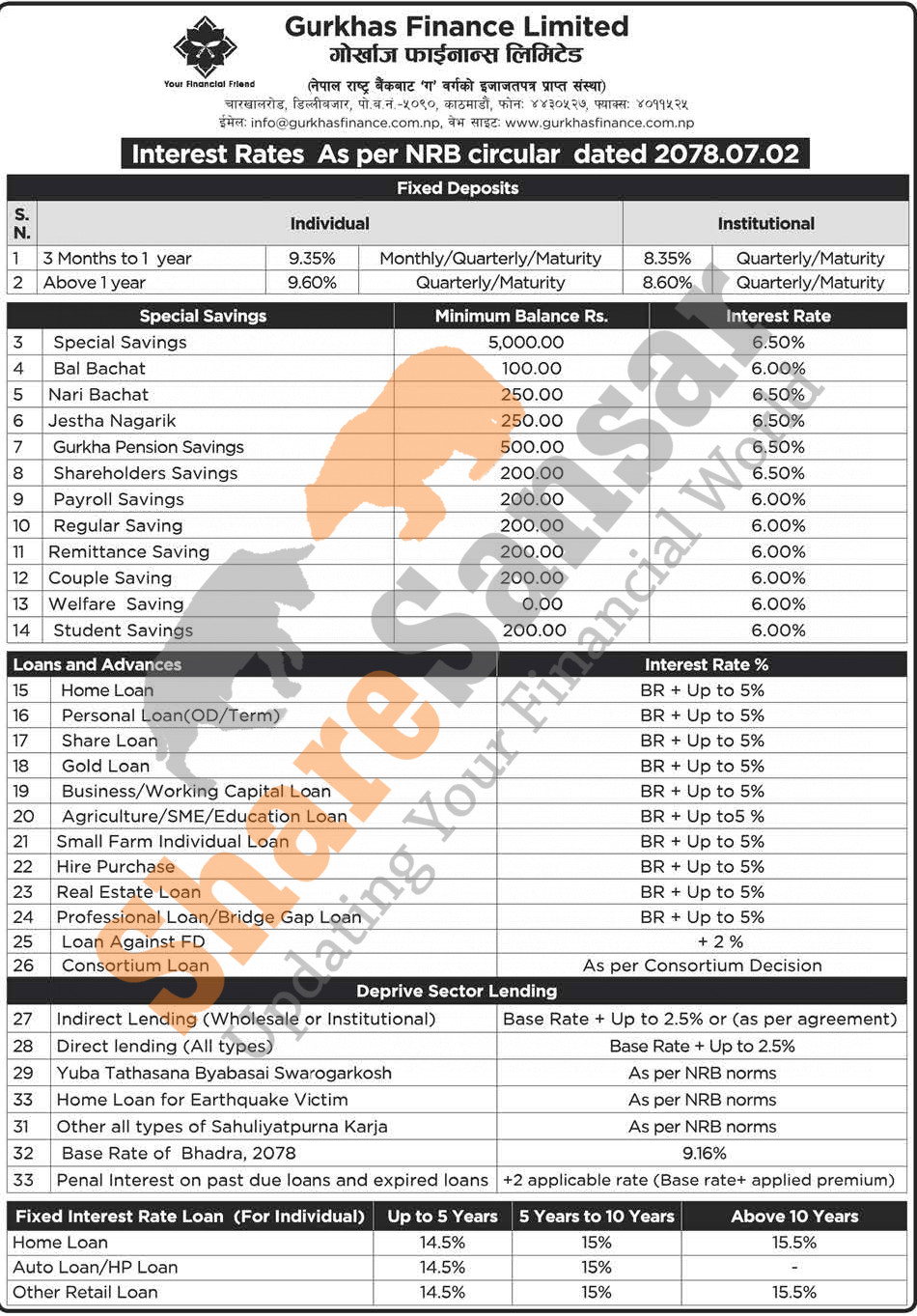 Gurkhas Finance Limited has published a notice regarding new revised interest rate for the month of Kartik, 2078.