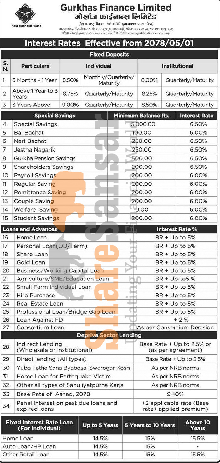 Gurkhas Finance Limited has published a notice regarding the new interest rate for deposit and loan products and it's effective from 1st Bhadra, 2078.