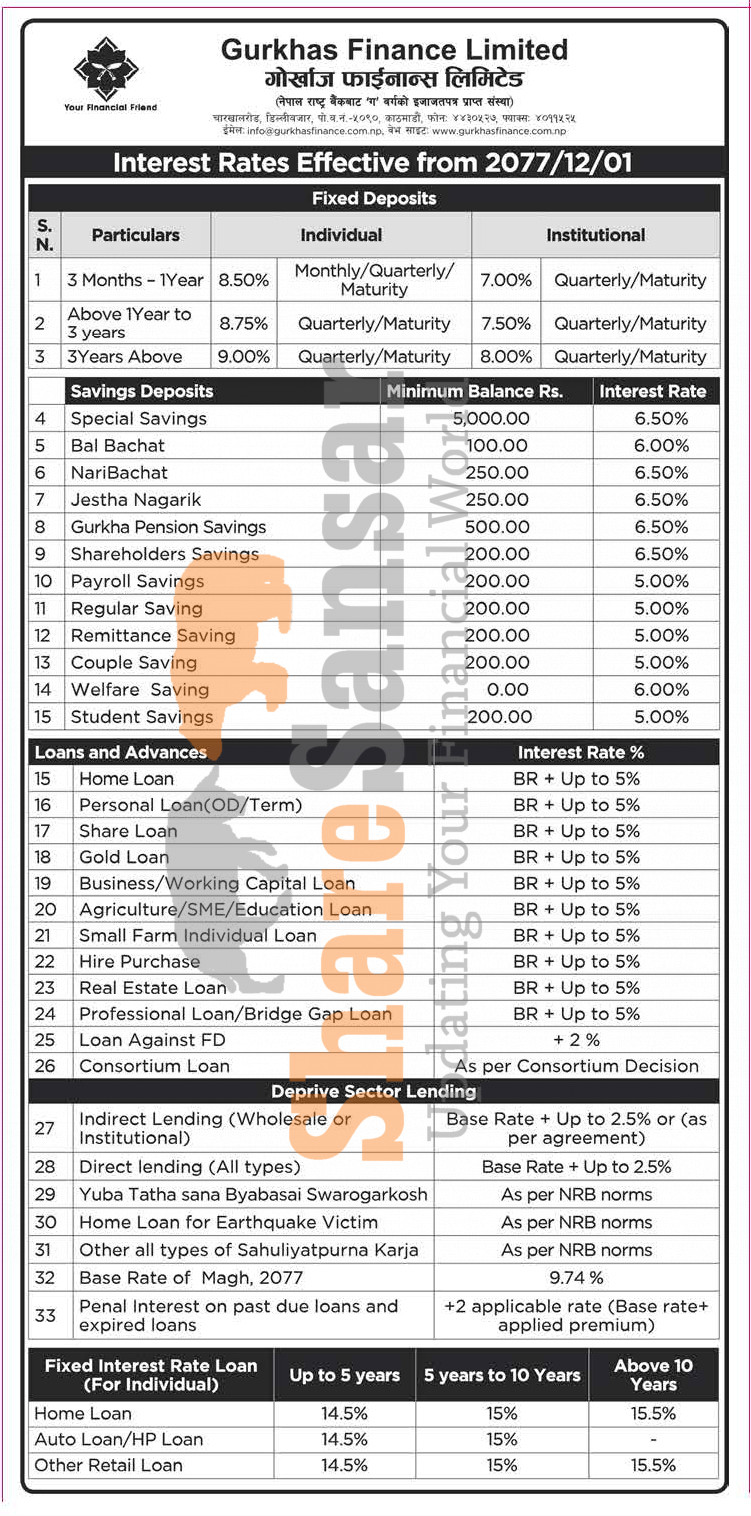 Gurkhas Finance Limited has published a notice regarding the new interest rate for deposit and loan products and it's effective from 1st Chaitra, 2077.