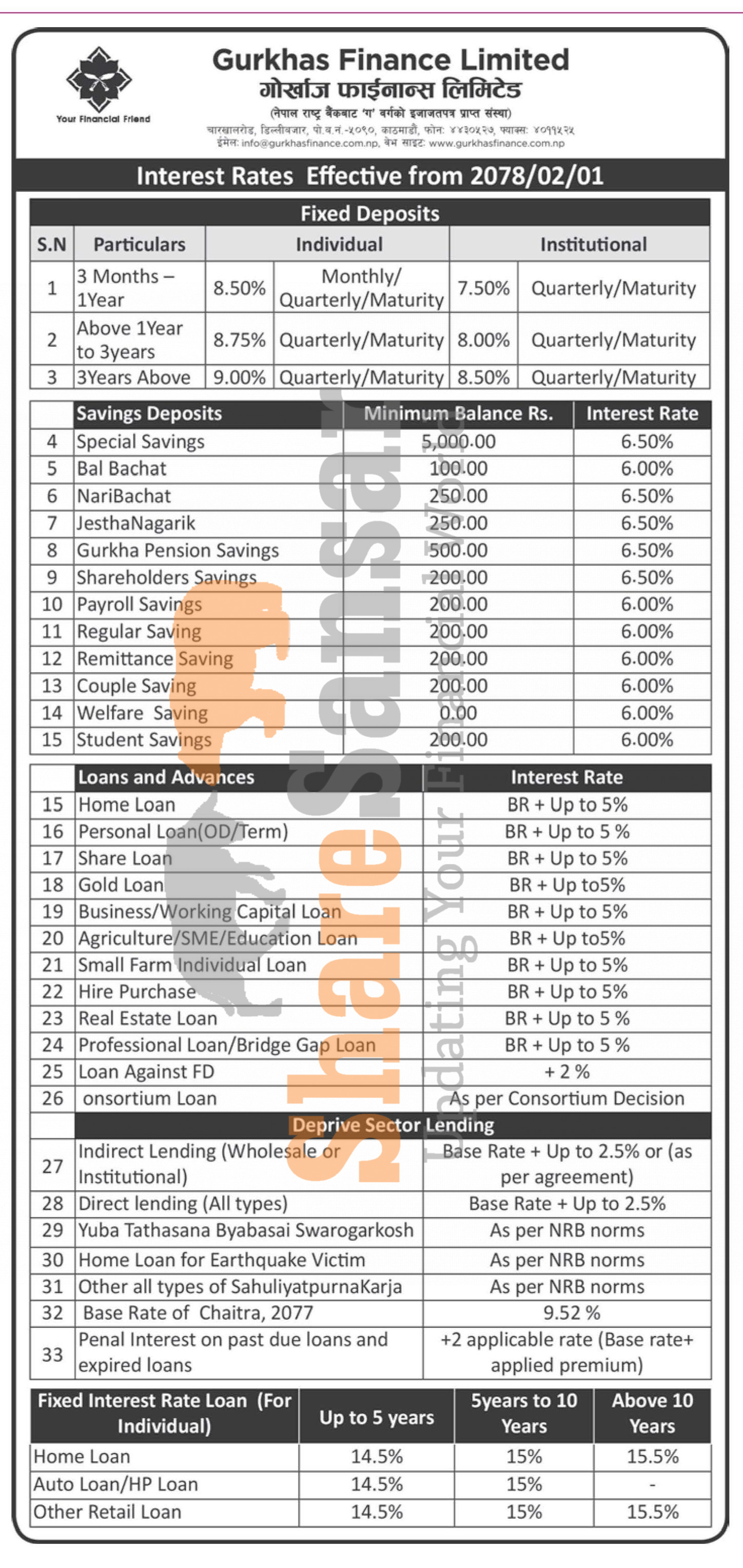 Gurkhas Finance Limited has published a notice regarding the new interest rate for deposit and loan products and it's effective from 1st Jestha, 2078.