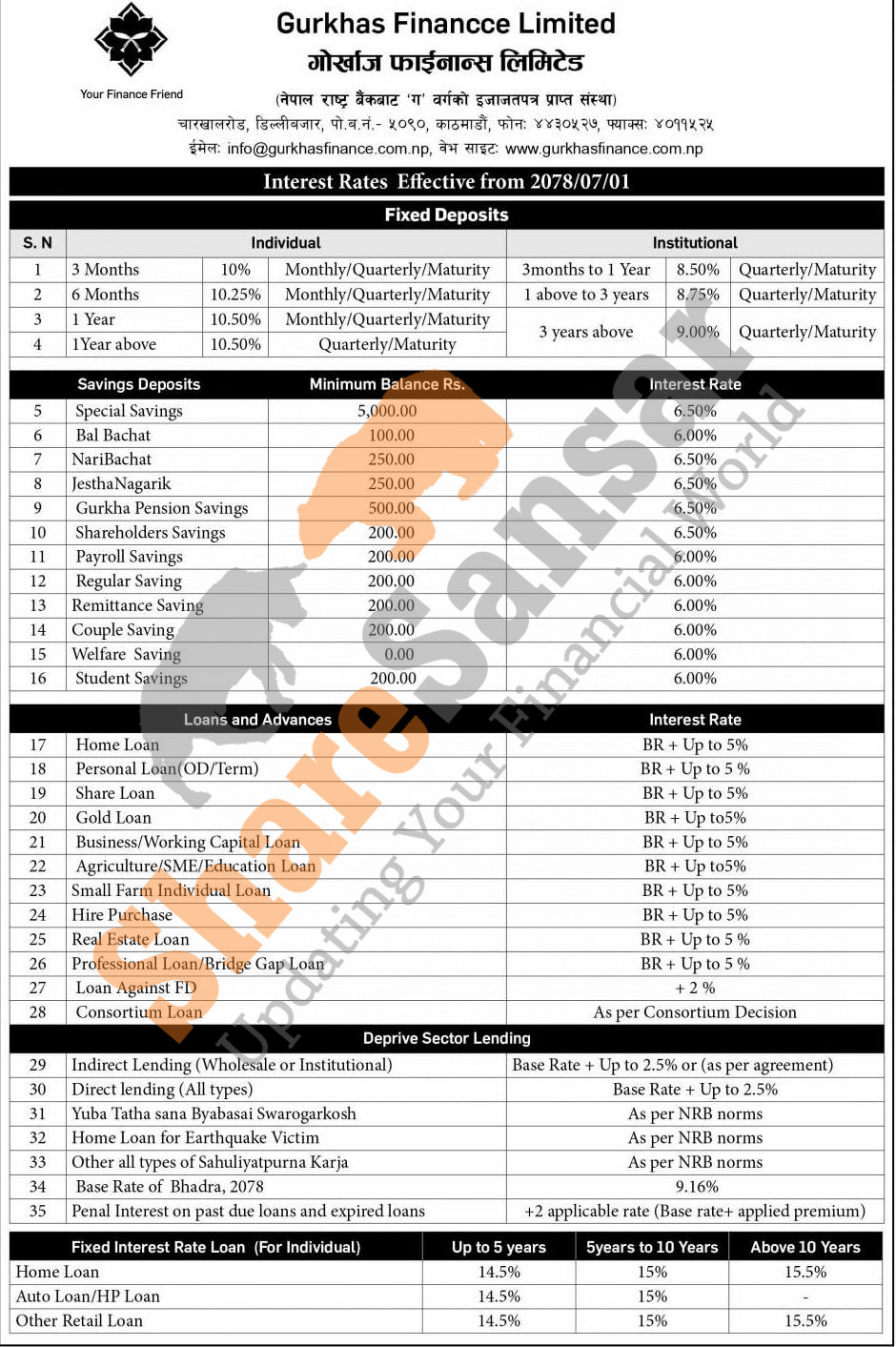 Gurkhas Finance Limited has published a notice regarding the new interest rate for deposit and loan products and it's effective from 1st Kartik, 2078.