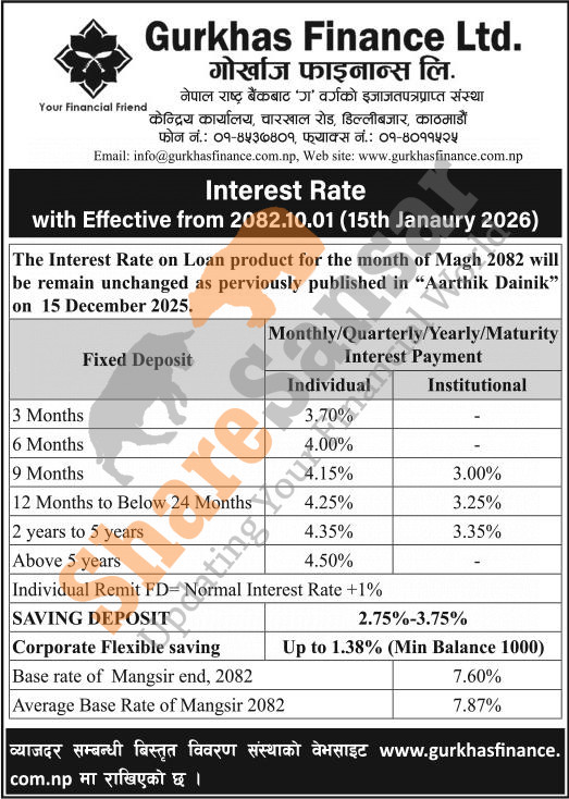 Gurkhas Finance Limited has published a notice regarding the new interest rate for deposit and loan products and it's effective from 1st Magh, 2082.