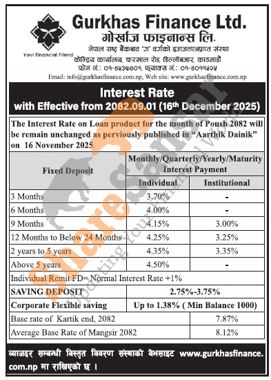 Gurkhas Finance Limited has published a notice regarding the new interest rate for deposit and loan products and it's effective from 1st Poush, 2082.