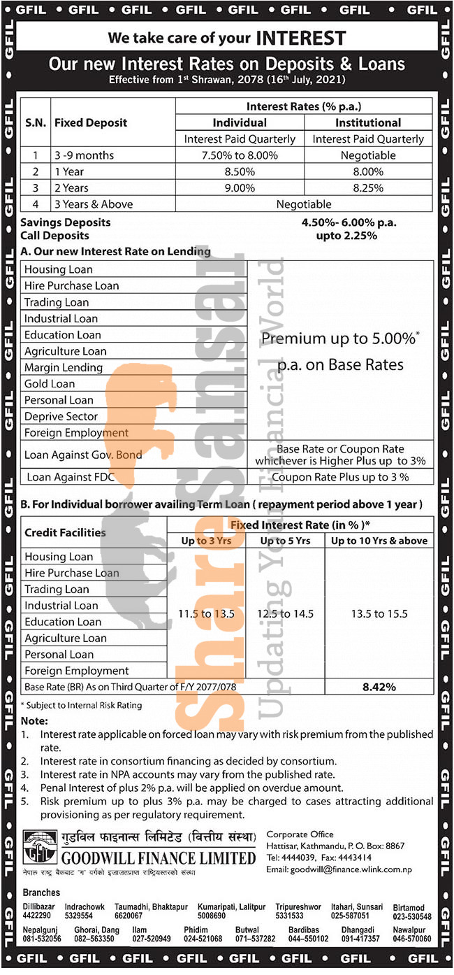 Goodwill Finance Limited has published a notice regarding the new interest rate for deposit and loan products and it's effective from 1st Shrawan, 2078.