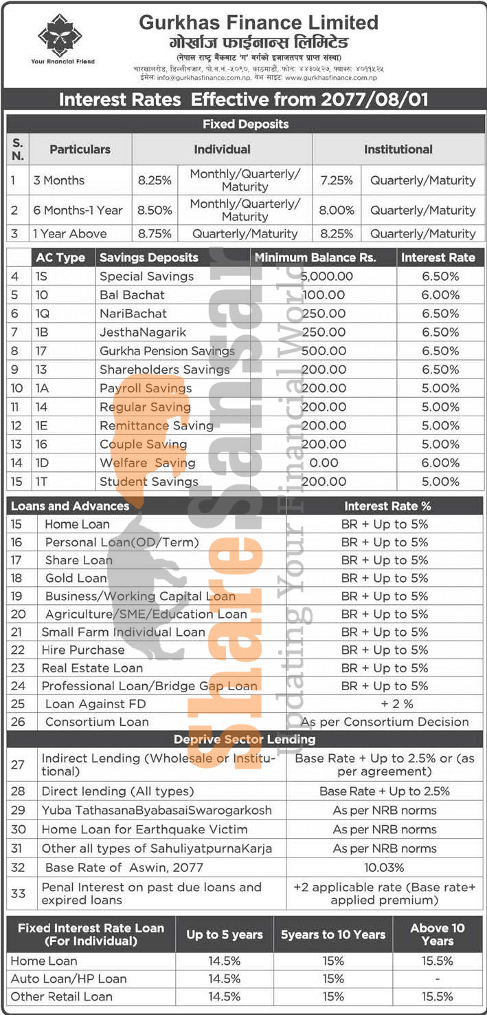 Gurkhas Finance Limited has published a notice regarding the new interest rate for its deposit products and it's effective from 1st Mangsir, 2077.