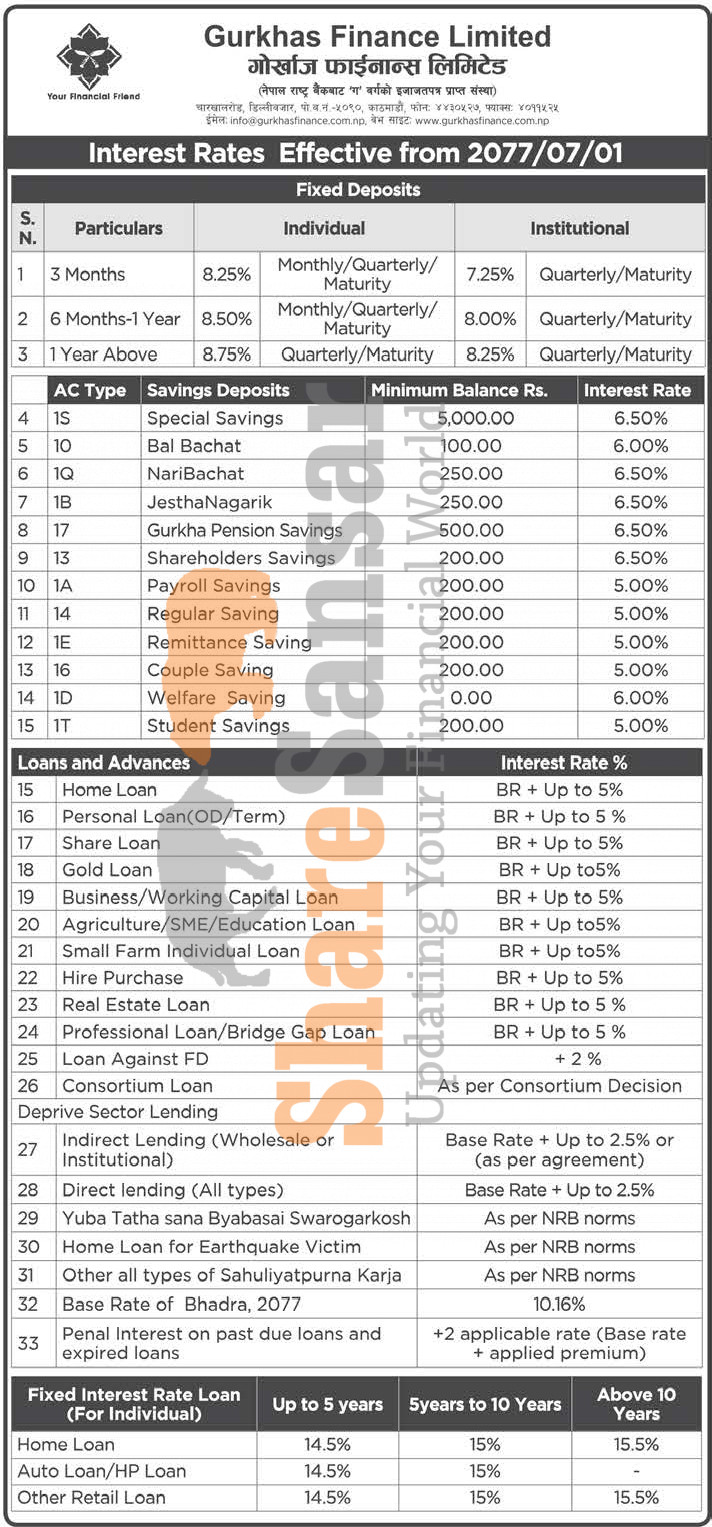 Gurkhas Finance Limited has published a notice regarding the new interest rate for its loan and deposit products and it's effective from 1st Kartik, 2077.