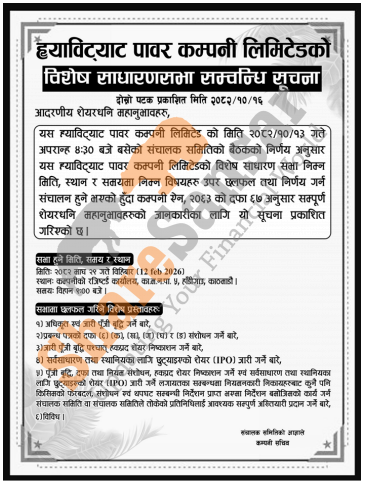 Habitat Power Company Limited has announced its SGM going to be held on 29th Magh, 2082.