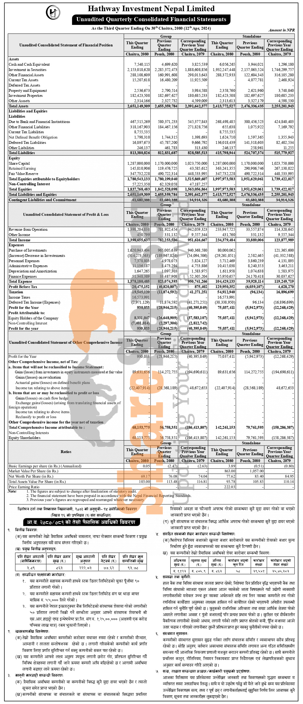 Hathway Investment Nepal Limited has posted a net profit of Rs 75.03 million and published its 3rd quarter company analysis of the fiscal year 2080/81.