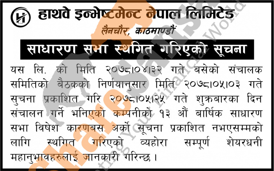 Hathway Investment Nepal Limited has postponed its 13th AGM going to be held on 25th Bhadra, 2078 until further notice.