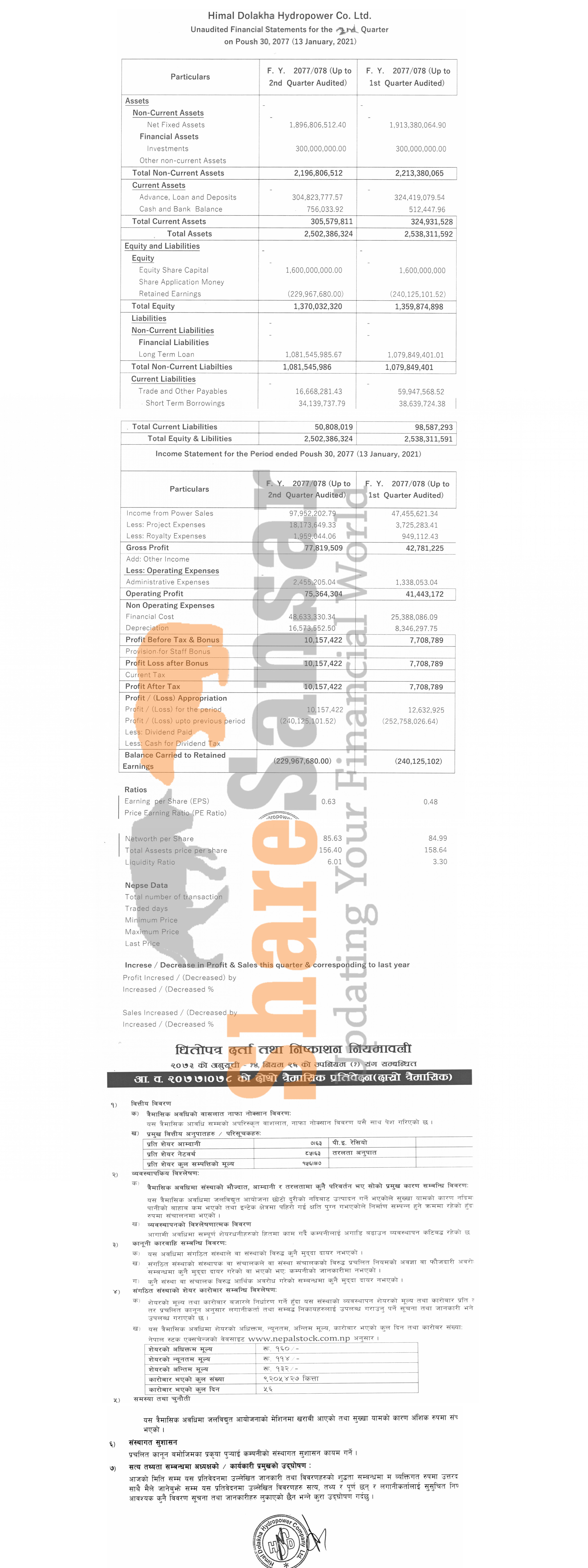 Himal Dolakha Hydropower Company Limited has posted a net profit of Rs 10.15 million and published its 2nd quarter company analysis of the fiscal year 2077/78.