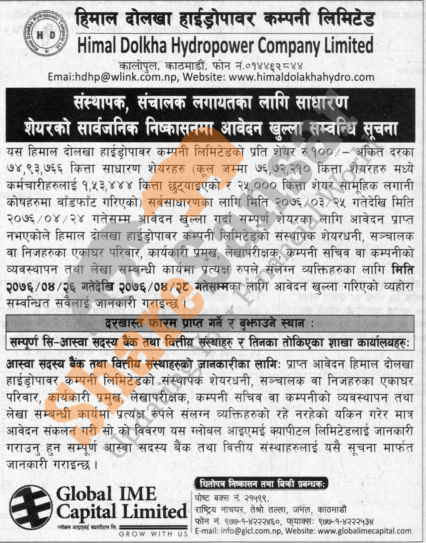 Himal Dolakha Hydropower Company Limited has published notice regarding IPO opening for its directors, promoters CEO and their family for three days.