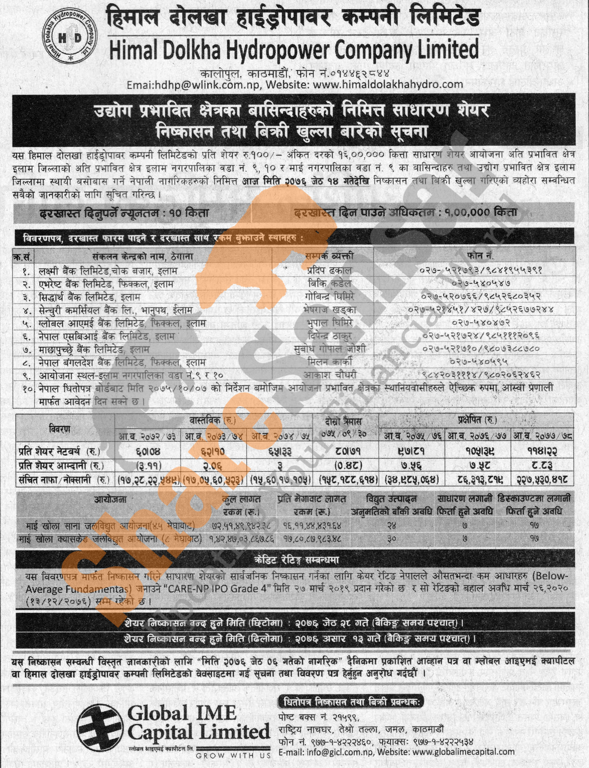 Himal Dolkha Hydropower Company Limited is issuing its 16,00,000 units IPO shares the project affected local residents of Ilam Municipality ward no. 9 & 10 and Mai Municipality ward no. 9 from today (14th Jestha, 2076).
