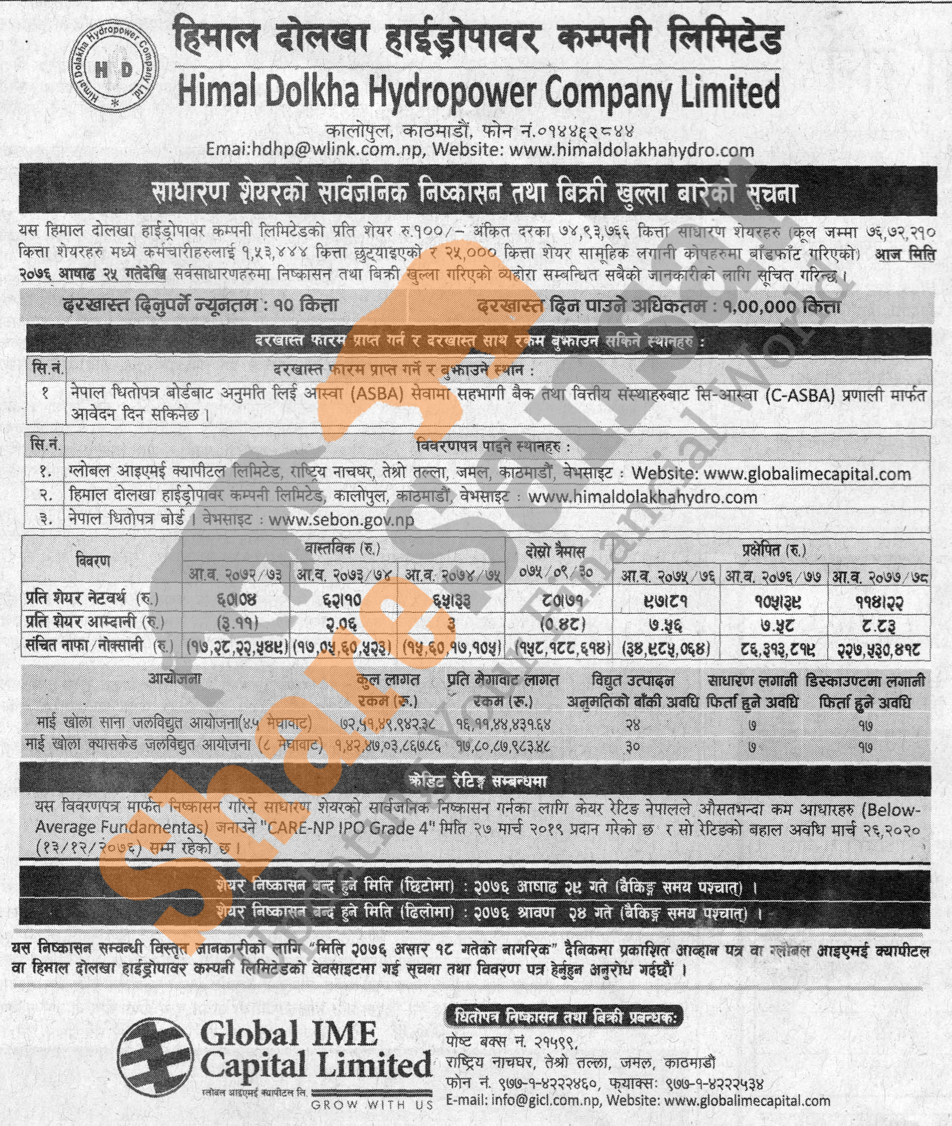 Himal Dolkha Hydropower Company Limited is issuing its 76,72,210 units IPO shares to the general public from (25th Ashad, 2076).