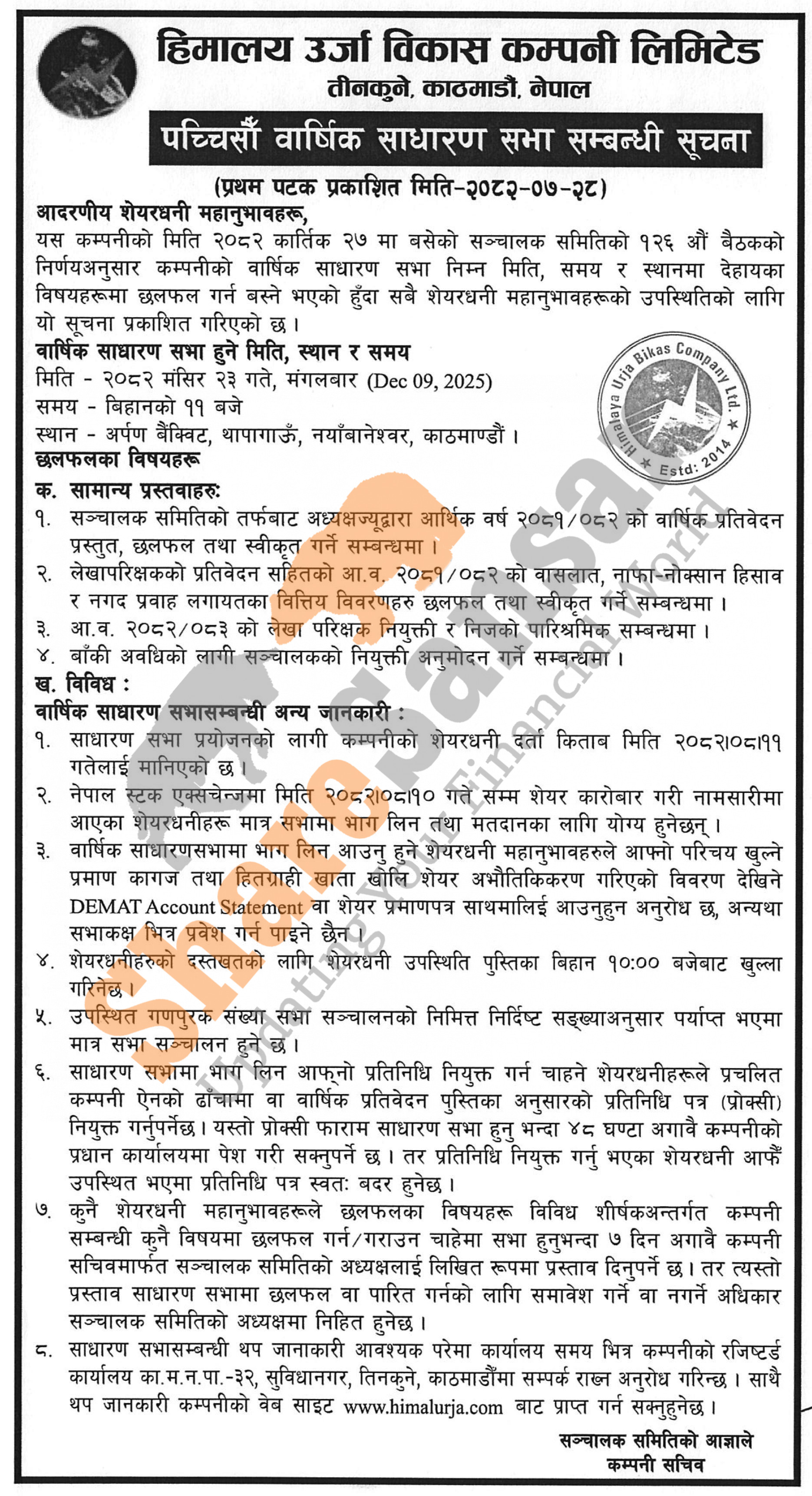 Himalaya Urja Bikas Company Limited has announced its 25th AGM going to be held on 23rd Mangsir, 2082.