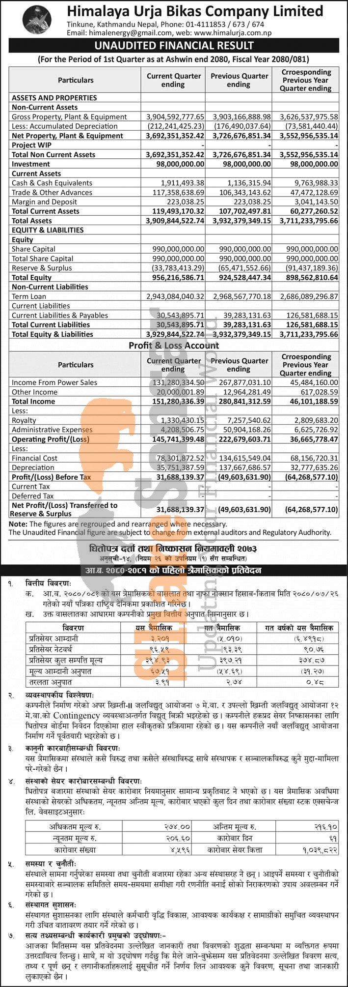 Himalaya Urja Bikas Company Limited has posted a net profit of Rs 31.68 million during the 1st quarter of the fiscal year 2080/81.