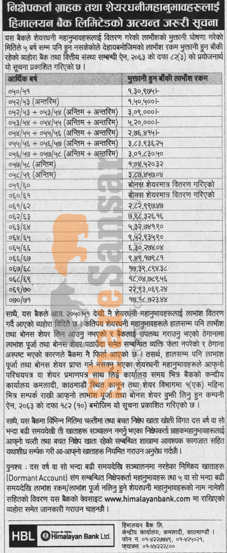 Himalayan Bank International Limited urges its shareholders to collect uncollected due dividends.