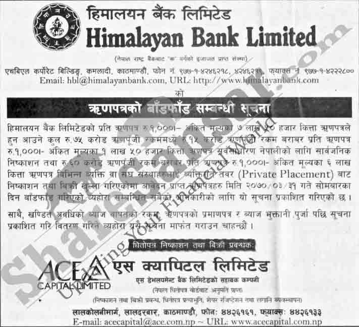 Himalayan Bank Limited has allotted its Rs. 750 million Redeemable "8% HBL Debenture 2077" on 31st Ashad, 2070.