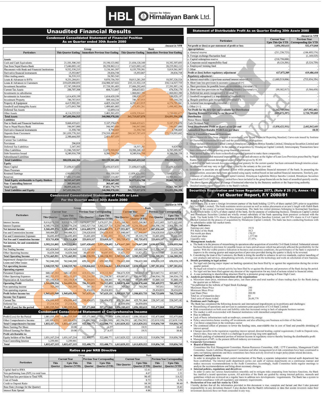 Himalayan Bank Limited has posted a net profit of Rs 1.05 billion and published its 1st quarter company analysis of the fiscal year 2080/81.