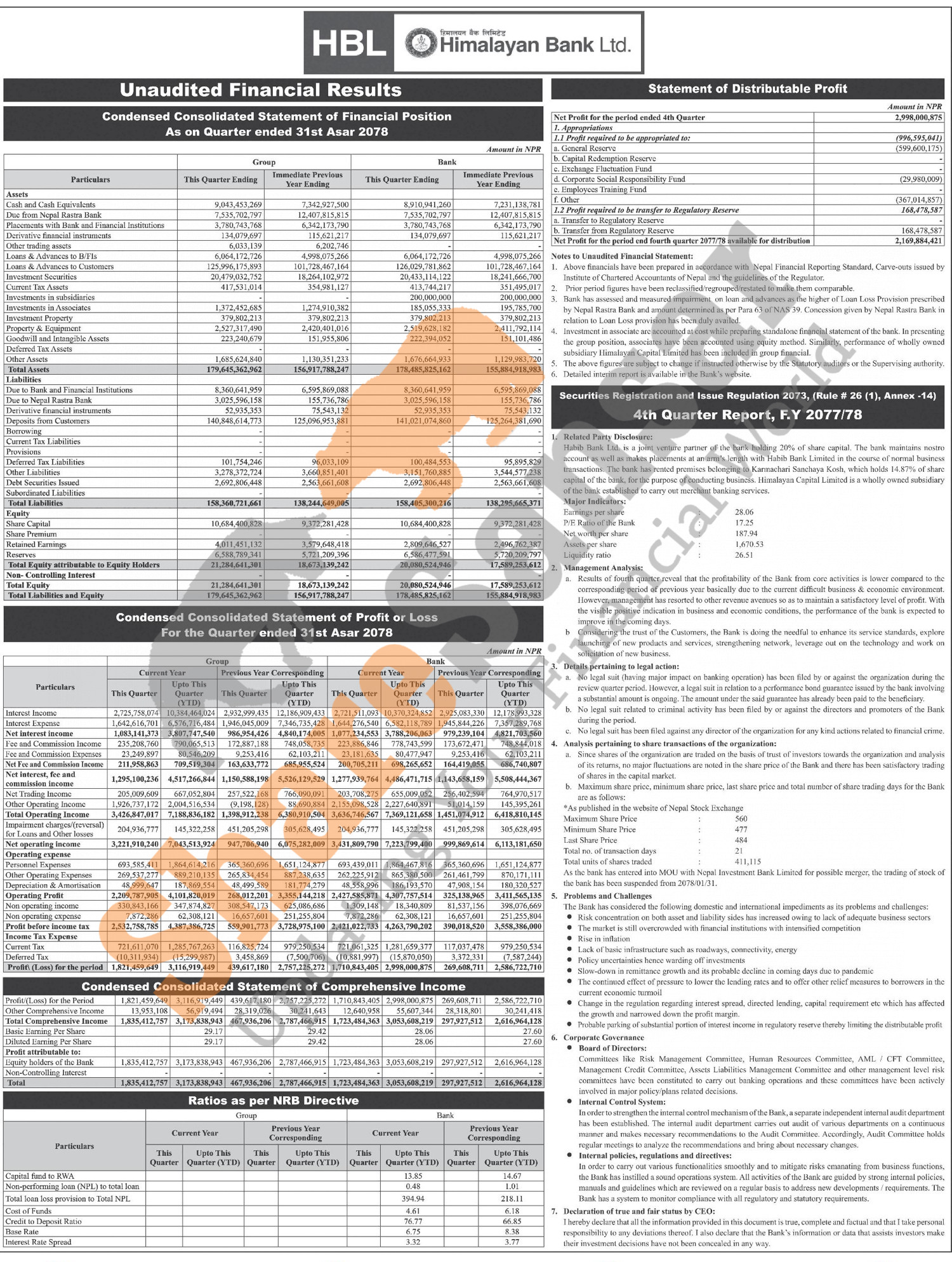 Himalayan Bank Limited has posted a net profit of Rs 2.99 billion and published its 4th quarter company analysis of the fiscal year 2077/78.