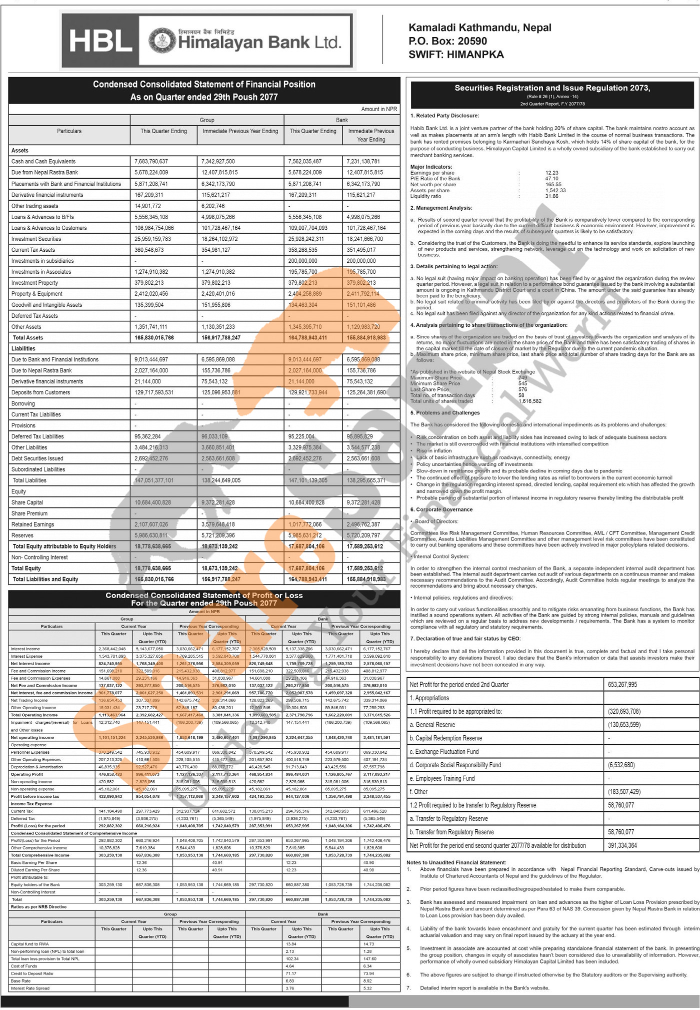Himalayan Bank Limited has posted a net profit of Rs 653.26 million and published its 2nd quarter company analysis of the fiscal year 2077/78.