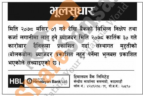 Himalayan Bank Limited has published a notice regarding correction on its interest rate .
