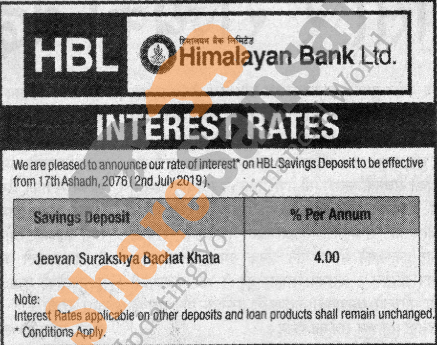 Himalayan Bank Limited has published a notice regarding new interest rate and its effective from 17th Ashad, 2076.