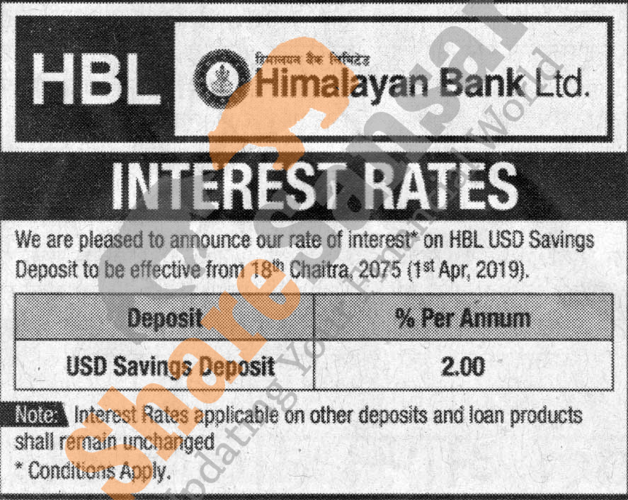 Himalayan Bank Limited has published a notice regarding new interest rate and its effective from 18th Chaitra, 2075.