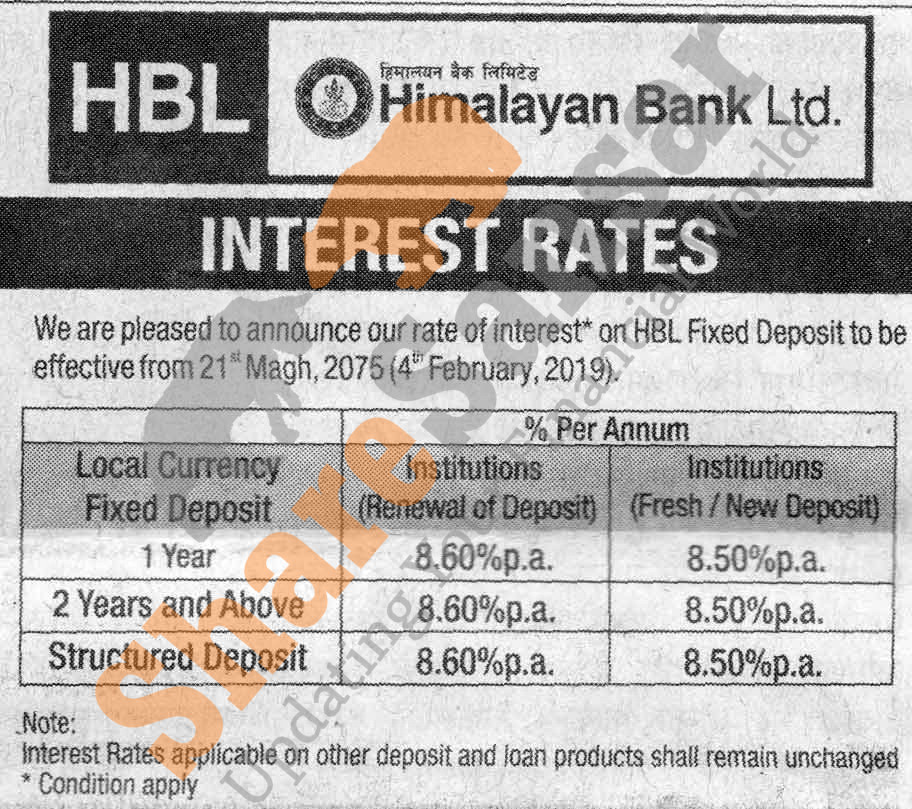 Himalayan Bank Limited has published a notice regarding new interest rate and its effective from 21st Magh, 2075.