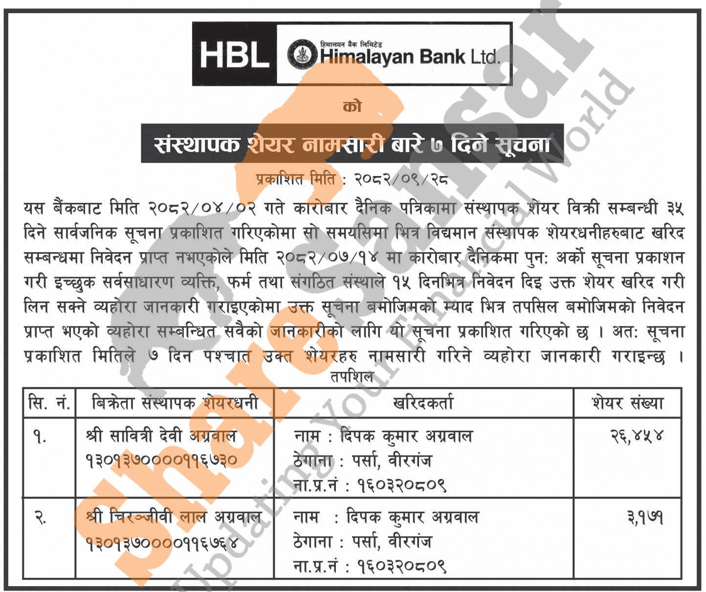 Himalayan Bank Limited has published a notice regarding ownership transfer of promoter shares.