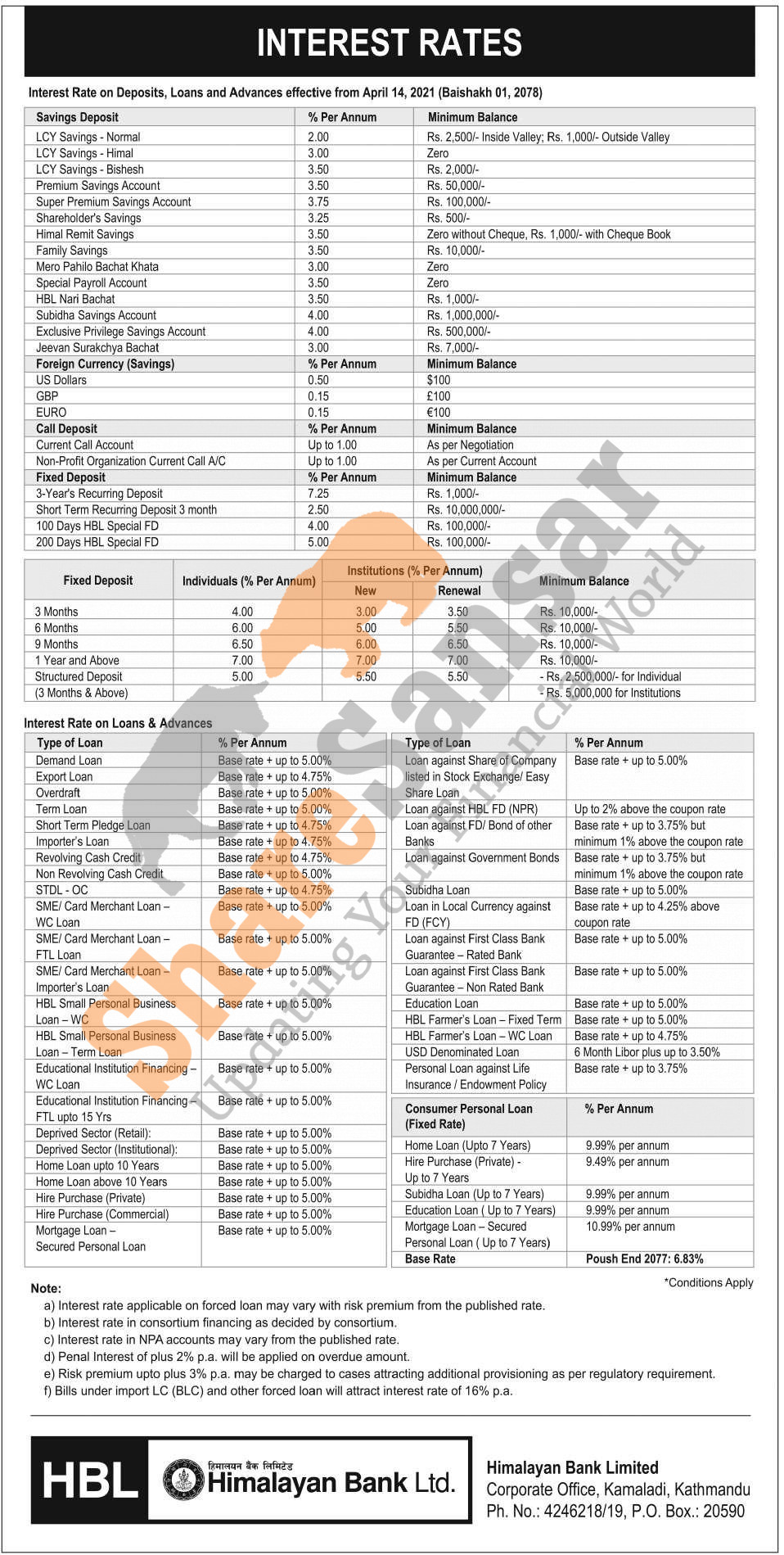 Himalayan Bank Limited has published a notice regarding the new interest rate for deposit and loan products and it's effective from 1st Baisakh, 2078.