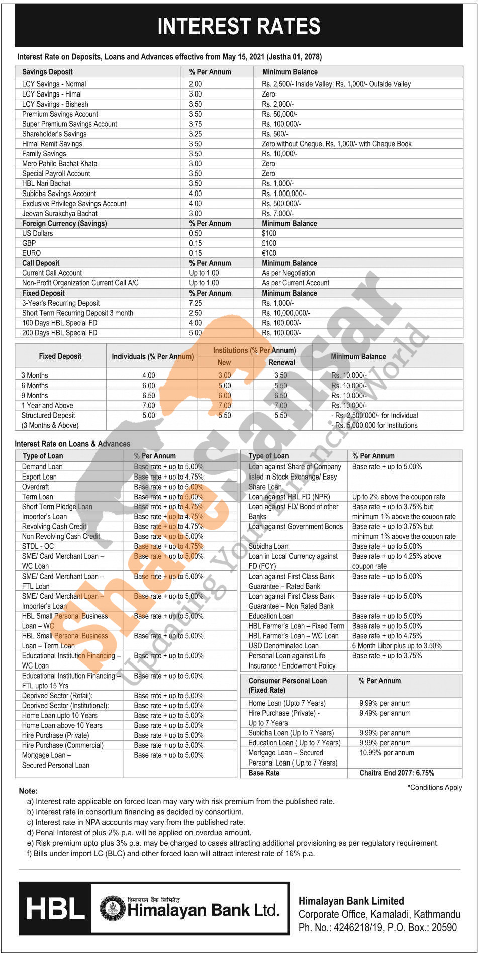 Himalayan Bank Limited has published a notice regarding the new interest rate for deposit and loan products and it's effective from 1st Jestha, 2078.