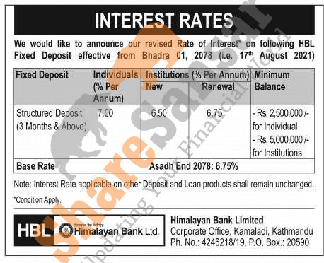 Himalayan Bank Limited has published a notice regarding the new interest rate for deposit products and it's effective from 1st Bhadra, 2078.