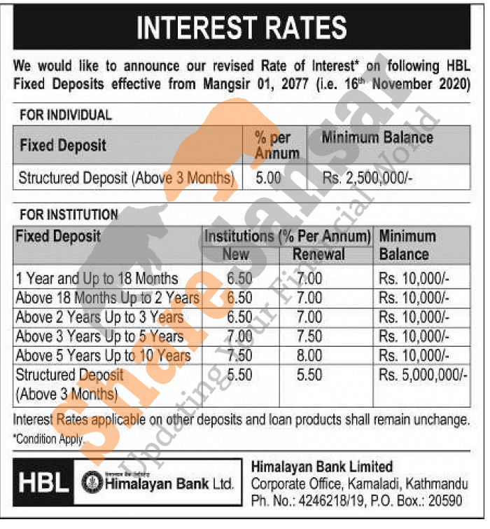 Himalayan Bank Limited has published a notice regarding the new interest rate for its deposit products and it's effective from 1st Mangsir, 2077.