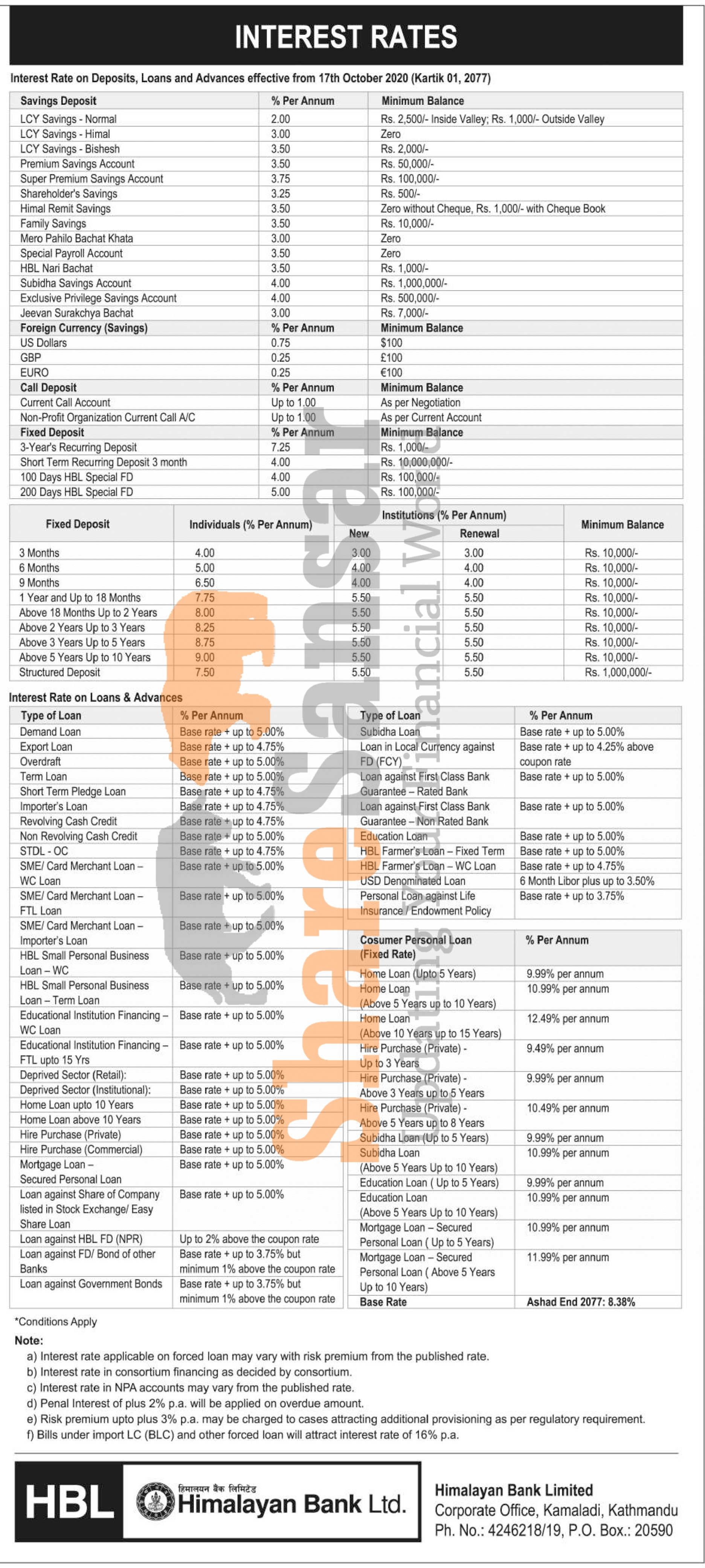 Himalayan Bank Limited has published a notice regarding the new interest rate for its loan and deposit products and it's effective from 1st Kartik, 2077.