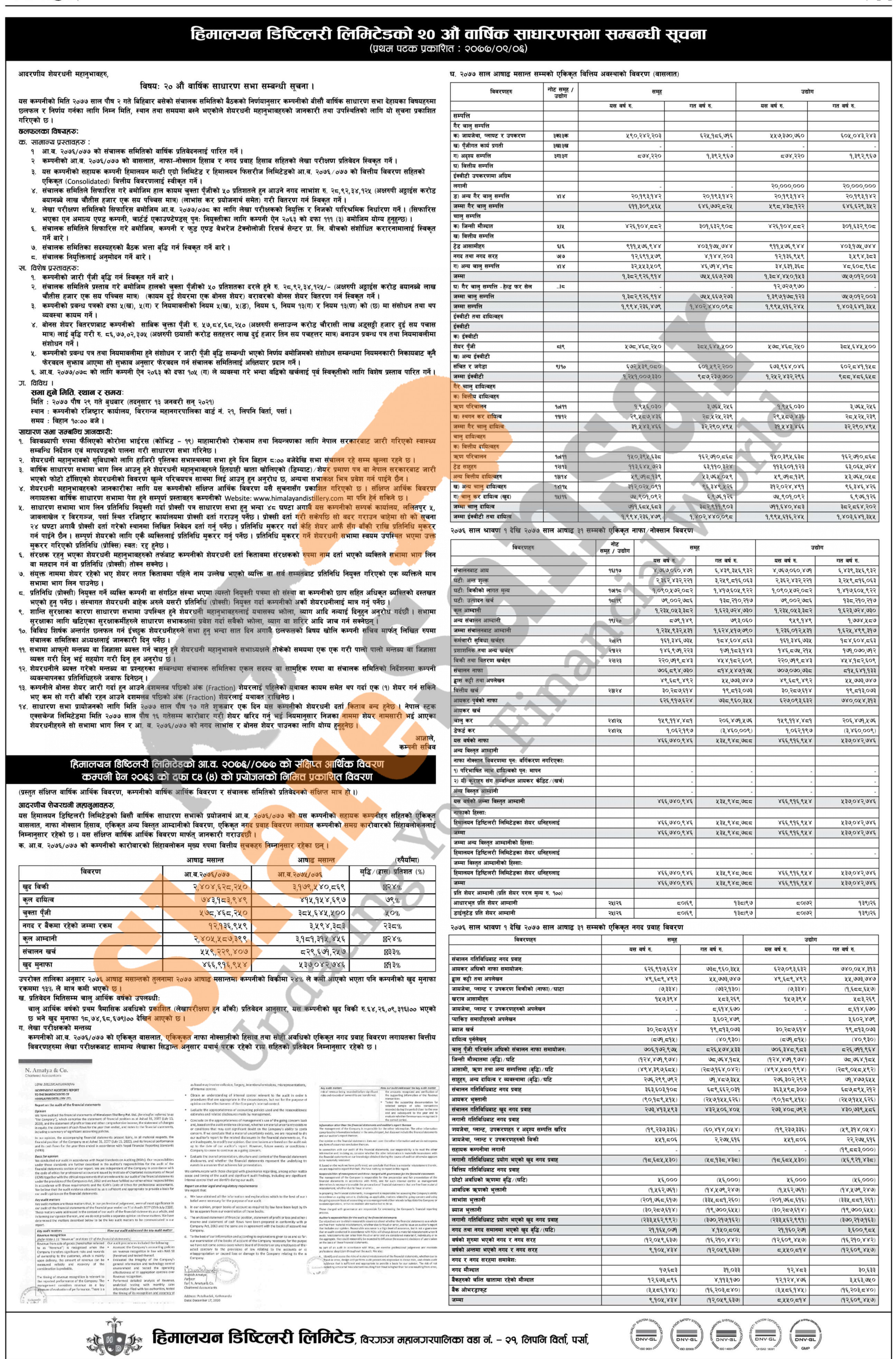 Himalayan Distillery Limited has announced its 20th AGM going to be held on 29th Poush, 2077, and has published audited financial highlight of FY 2076/77.