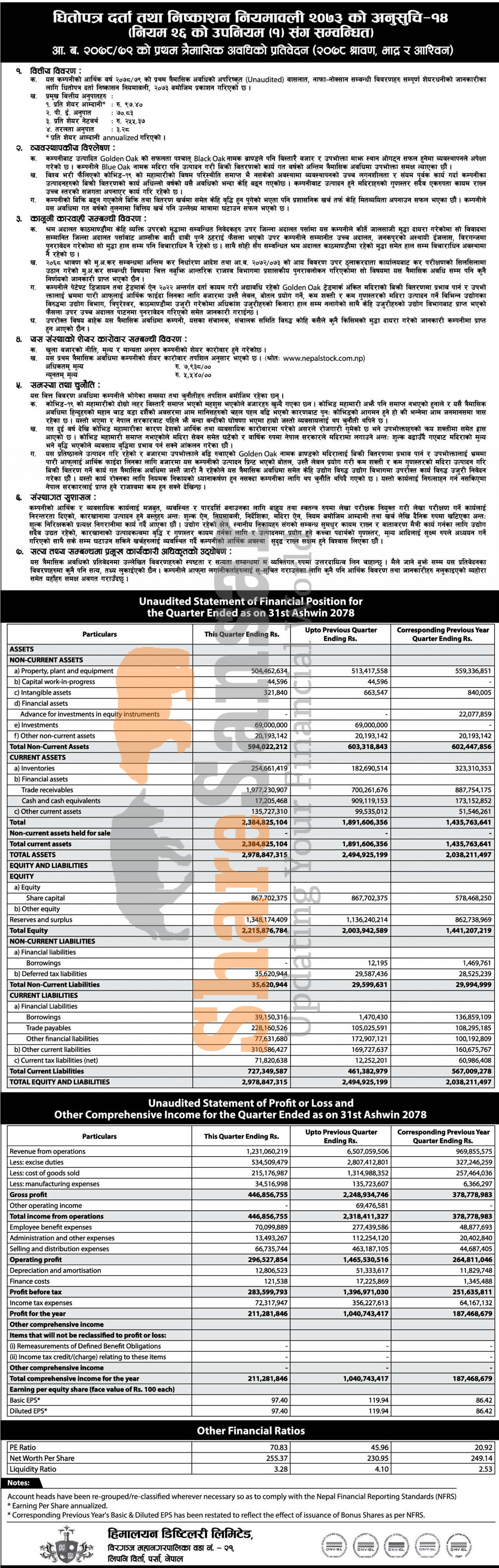 Himalayan Distillery Limited has posted a net profit of Rs 211.28 million and published its 1st quarter company analysis of the fiscal year 2078/79.
