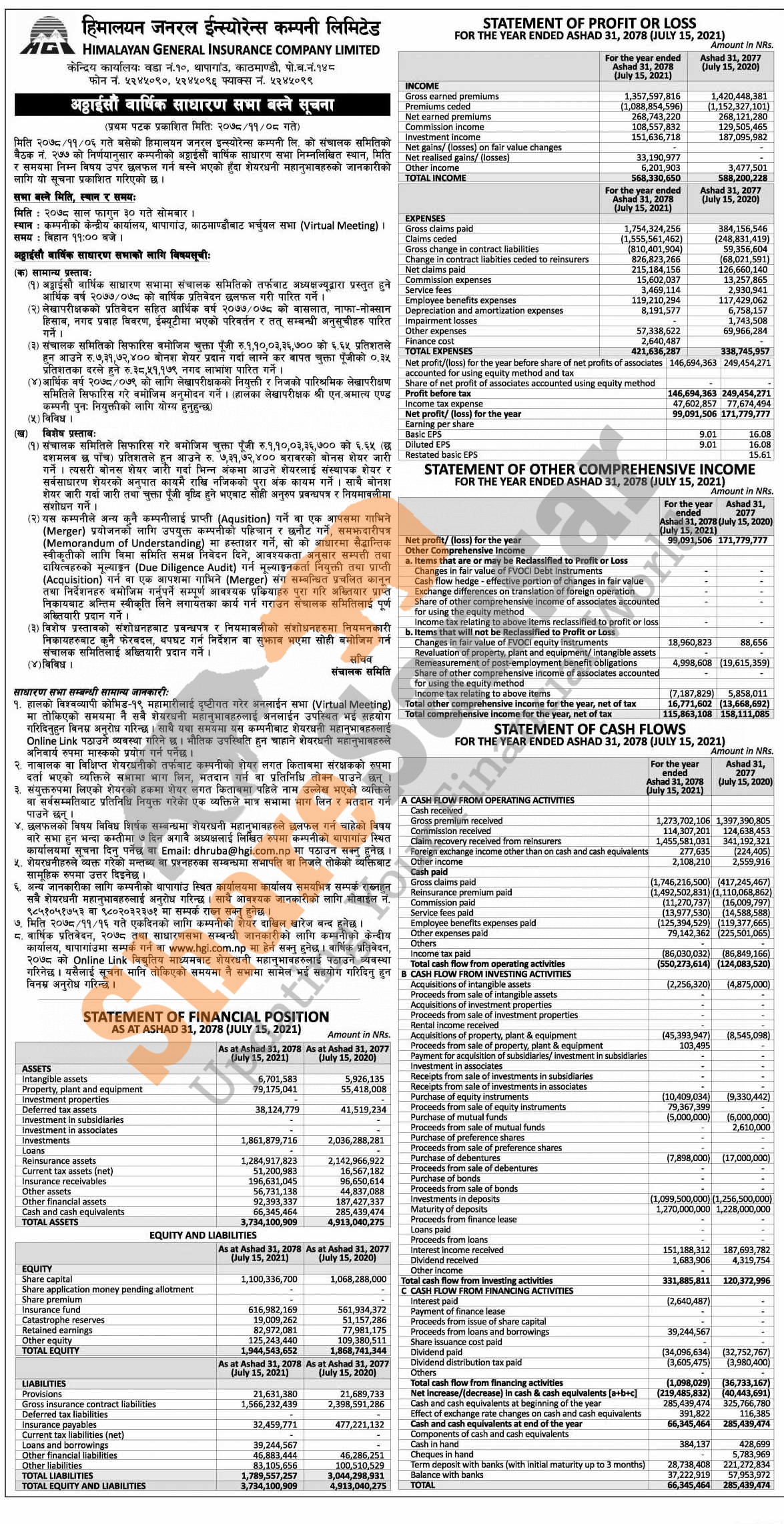 Himalayan General Insurance Company Limited has announced its 28th AGM going to be held on 30th Falgun, 2078 and its annual financial statement of the fiscal year 2077/78.