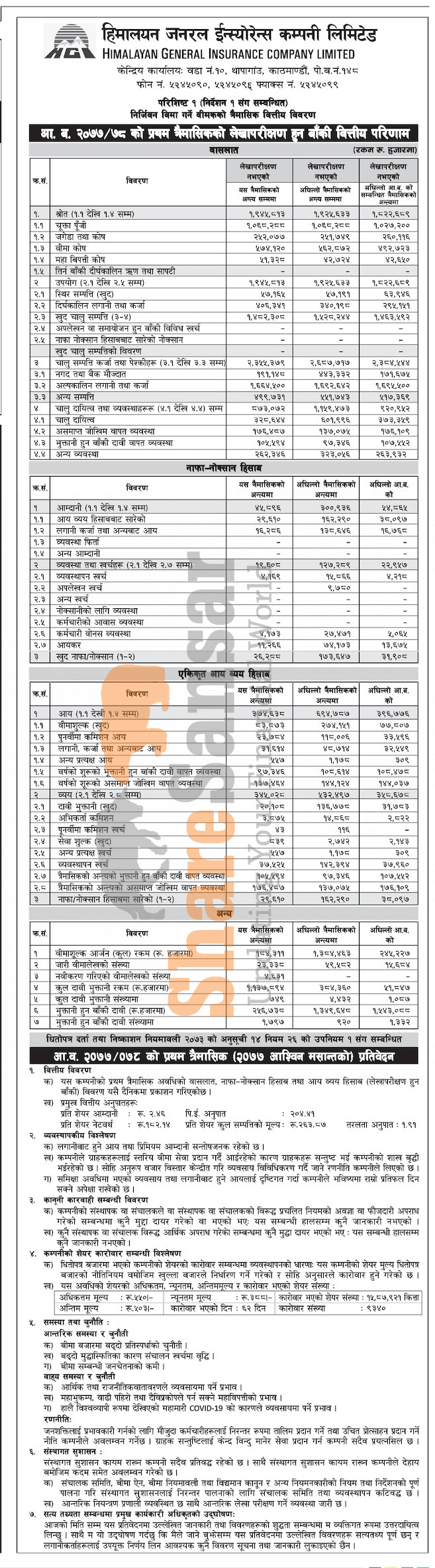 Himalayan General Insurance Company Limited has posted a net profit of Rs 26.28 million and published its 1st quarter company analysis of the fiscal year 2077/78.