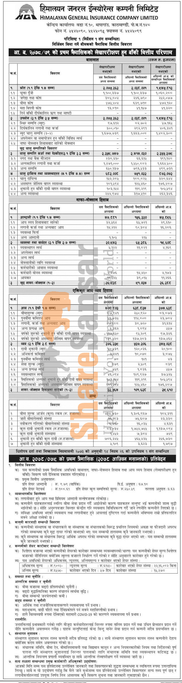 Himalayan General Insurance Company Limited has posted a net profit of Rs 26.93 million and published its 1st quarter company analysis of the fiscal year 2078/79.