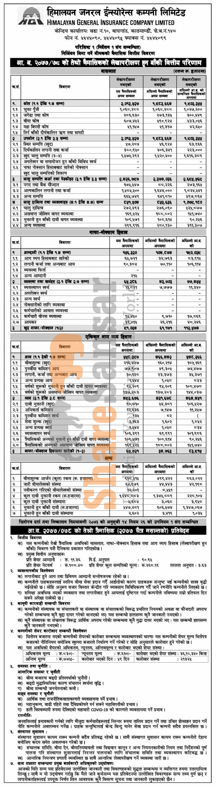 Himalayan General Insurance Company Limited has posted a net profit of Rs 91.03 million and published its 3rd quarter company analysis of the fiscal year 2077/78.
