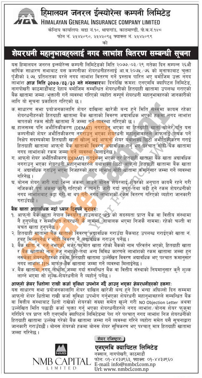 Himalayan General Insurance Company Limited is distributing a 3.75% cash dividend directly to bank accounts of its shareholders.